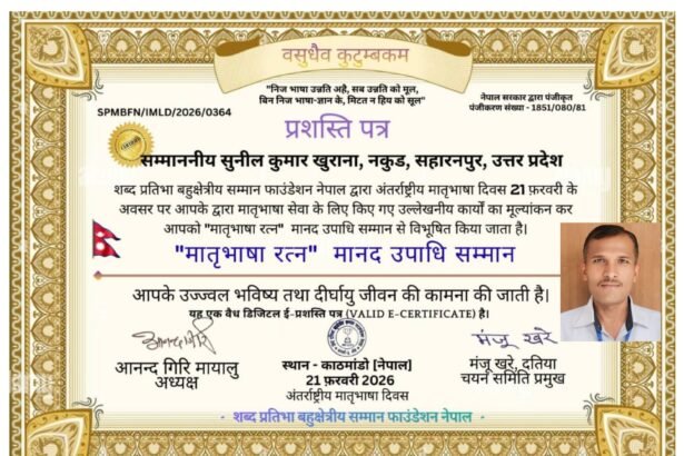 काठमांडू, 21 फ़रवरी, सहारनपुर के सुप्रसिद्ध कवि, समाजसेवीं एवं शिक्षाविद् सुनील कुमार खुराना को नेपाल की राजधानी काठमांडू में मातृभाषा…