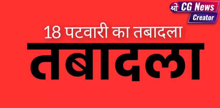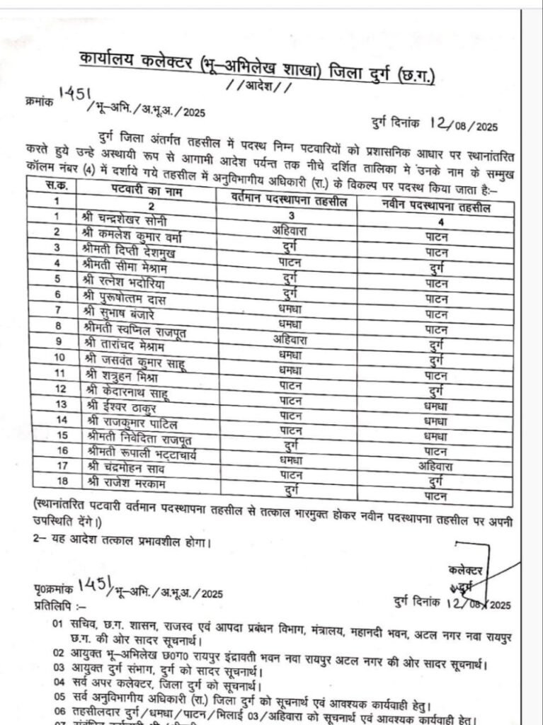 भिलाई। दुर्ग जिला अंतर्गत पाटन दुर्ग अहिवारा एवं धमधा तहसील के 18 पटवारी का तबादला कर दिया गया है।