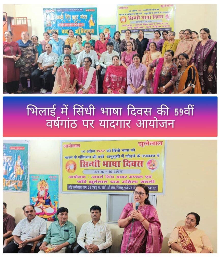 हर वर्ष की तरह इस वर्ष भी साईं झुलेलाल धाम 32 एकड़ में आदर्श सिन्ध ब्रादर मंडल एवं भारतीय सिंधु सभा भिलाई व साईं झुलेलाल महिला मण्डली के संयुक्त तत्वावधान में सिंधी भाषा दिवस की 59वीं वर्षगांठ को 10 अप्रैल शुक्रवार को अत्यंत ही धूमधाम से मनाया गया।यह आयोजन 10 अप्रैल 1967 को भारतीय संविधान की 8वीं अनुसूची में सिंधी भाषा को आधिकारिक मान्यता मिलने की याद में समिति द्वारा हर वर्ष अपने धर्म,जाति संस्कारों से दूर हो रहे एवं सभ्यता भूल रहे नौनिहालों और वरिष्ठों को जोड़े रखने और सहेजने के लिये आयोजित किया गया।विश्व की सबसे पुरानी सिंधु घाटी सभ्यता से जन्मी सिन्धी भाषा की ऐतिहासिक धरोहर को जीवंत रखने हेतु इस दिन समाज की ओर से समाज के सभी आयु वर्ग के प्रतिभागियों के लिये प्रतियोगिता आयोजित की गई थी।