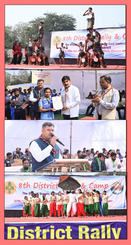 रायपुर, 27 दिसंबर, दक्षिण पूर्व मध्य रेलवे, रायपुर ज़िला स्काउट्स एवं गाइड्स संघ द्वारा आयोजित 8 वी वार्षिक जिला रैली एवं शिविर का भव्य शुभारंभ आज खारुन रेल विहार इंजीनियरिंग कॉलोनी रायपुर में हुआ। तीन दिवसीय इस आयोजन (27 से 29 दिसंबर 2025) में रेलवे विद्यालयों एवं ओपन ग्रुप्स के लगभग 400 स्काउट्स एवं गाइड्स सक्रिय रूप से भाग ले रहे हैं।