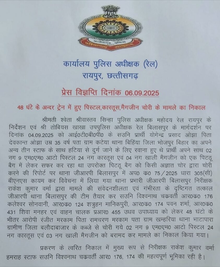 रायपुर जीआरपी ने सीसीटीवी फुटेज की जांच की और आरोपी रंजीत मरकाम को गिरफ्तार किया। वह काफी शातिर निकला और पुलिस को गुमराह करने के लिए दस्तावेज व कपड़े अलग-अलग स्थानों पर फेंक दिए। जांच के दौरान बिलासपुर रेलवे स्टेशन के पास झाड़ियों से सामान मिला। जीआरपी ने अंततः आरोपी को पकड़कर उससे पूरा चोरी गया सामान बरामद कर लिया। जीआरपी एसपी श्वेता सिन्हा ने मामले का खुलासा किया। मामला सुरक्षा में चूक को उजागर करता है, लेकिन समय पर कार्रवाई से बड़ा खतरा टल गया।