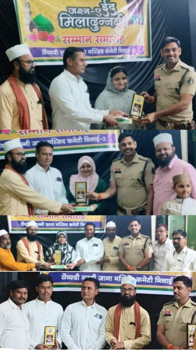 भिलाई। सैय्यदी सुन्नी जामा मस्जिद मजार कमेटी भिलाई-तीन में जश्ने ईद मिलाद-उन-नबी सिलसिले में रविवार 7 सितंबर की शाम विशेष सम्मान समारोह का आयोजन किया गया। इस दौरान समाज के विभिन्न क्षेत्र से प्रमुख लोगों का सम्मान किया गया, वहीं उच्च शिक्षा के क्षेत्र में अध्ययनरत युवाओं की भी हौसला अफजाई की गई। इसके पहले कमेटी की ओर से स्वास्थ्य शिविर और रक्तदान शिविर भी कमेटी की ओर से लगाया गया। दरगाह शरीफ परिसर में आयोजित सम्मान समारोह में पैगंबर हज़रत मुहम्मद सल्ललाहु अलैहि वसल्लम की दुनिया में आमद पर विभिन्न लोगों ने विचार व्यक्त किए। मस्जिद मजार कमेटी के सदर रुस्तम खान ने अपने स्वागत भाषण में आयोजन के महत्व पर प्रकाश डाला।