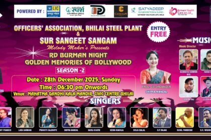 भव्य सांगीतिक सन्ध्या का आयोजन 28 दिसम्बर को स्थानीय कला मंदिर, सिविक सेंटर भिलाई में भिलाई नगर। सांगीतिक संस्था सुर…