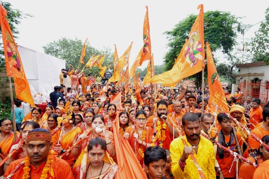 भिलाई। छत्तीसगढ़ की सांस्कृतिक राजधानी दुर्ग इस सावन एक ऐतिहासिक क्षण का साक्षी 27 जुलाई को बन गया। प्रातः 6 बजे, शिवनाथ कांवड़ यात्रा समिति के तत्वावधान में खारून नदी (कुम्हारी) से शिवनाथ नदी (महमरा एनीकट, दुर्ग) तक एक भव्य, दिव्य एवं ऐतिहासिक कांवड़ यात्रा निकाली गई।यात्रा का उद्देश्य केवल धार्मिक आस्था नहीं, बल्कि सनातन धर्म की एकता, सामाजिक समरसता और सांस्कृतिक पुनर्जागरण को सशक्त रूप से जनमानस तक पहुंचाना रहा। शिवनाथ कांवड़ यात्रा समिति के तत्वाधान में आयोजित इस कांवड़ यात्रा में जिला एवं प्रदेभर के नागरिक हजारों की संख्या में शामिल होकर हर हर महादेव एवं बोल बम के जयघोष के साथ भगवा रंग में रंगकर सनातन एकता, सामाजिक समरसता एवं सांस्कृतिक जागरण का संदेश दिया।