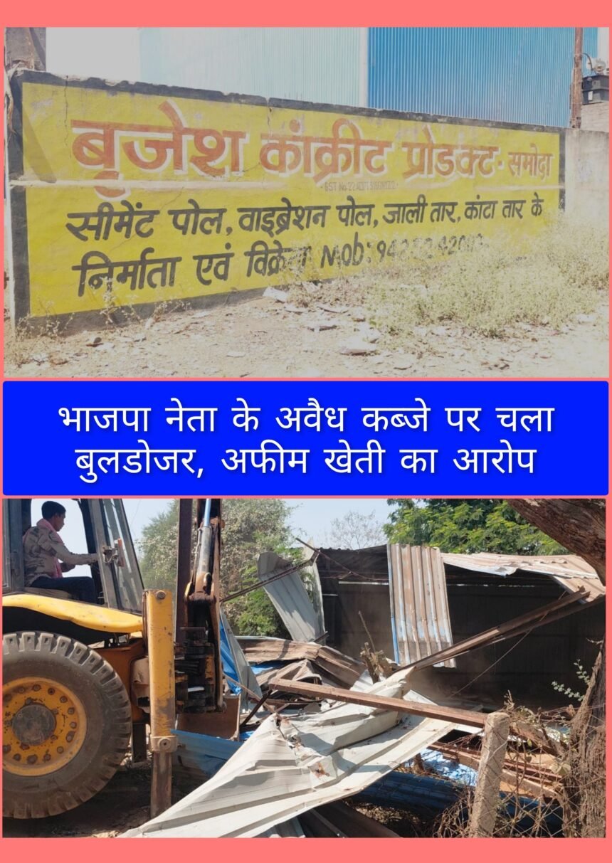 भिलाई, बहुचर्चित अफीम खेती प्रकरण में गिरफ्तार भाजपा नेता विनायक ताम्रकार के अवैध कब्जे पर गुरुवार को प्रशासन ने सख्त कार्रवाई करते हुए बुलडोजर चलाया। दुर्ग कलेक्टर अभिजीत सिंह के निर्देश पर राजस्व और प्रशासनिक अमले ने समोदा गांव में सरकारी जमीन पर बने निर्माण को हटाया।