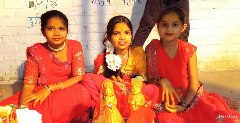 तस्वीरों में छोटी-छोटी बच्चियां दुल्हन के रूप में सजी हुई नजर आईं, जो अपने हाथों में लकड़ी के पुतरा-पुतरी को दूल्हा-दुल्हन के रूप में थामे इस परंपरा को निभा रही थीं। एक बालिका लाल पारंपरिक वेशभूषा और आभूषणों में सजी हुई पूरे आत्मविश्वास और खुशी के साथ आयोजन में भाग लेती दिखी, जो इस लोक परंपरा की जीवंतता को दर्शाता है।