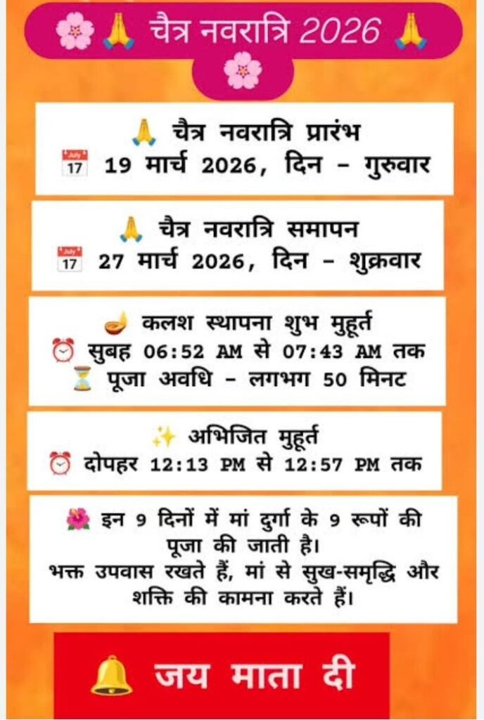 भिलाई, वाराणसी, वसंत ऋतु के आगमन के साथ चैत्र मास के शुक्ल पक्ष की प्रतिपदा से शुरू होने वाला वासंतिक नवरात्र इस वर्ष 19 मार्च से आरंभ होगा। प्रतिपदा तिथि क्षय होने के बावजूद पूरे दिन प्रतिपदा मिलने के कारण घर-घर में कलश स्थापना कर आदिशक्ति की आराधना की जाएगी और यह पर्व पूरे नौ दिनों तक चलेगा। नवरात्र का समापन 27 मार्च को भगवान श्रीराम के जन्मोत्सव राम नवमी के साथ होगा।