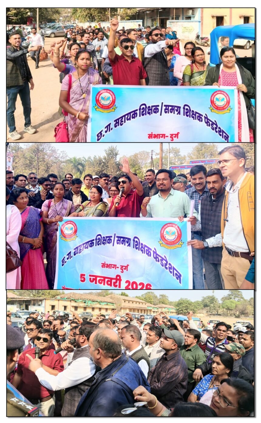 दुर्ग।छत्तीसगढ़ सहायक शिक्षक/समग्र शिक्षक फेडरेशन के बैनर तले आज शिक्षकों ने अपनी लंबित एवं जायज़ मांगों को लेकर जंगी प्रदर्शन किया तथा संयुक्त संचालक शिक्षा कार्यालय, दुर्ग का घेराव किया। बड़ी संख्या में उपस्थित शिक्षकों ने विभाग की उदासीन नीतियों के खिलाफ जोरदार नारेबाजी करते हुए शीघ्र निराकरण की मांग की।