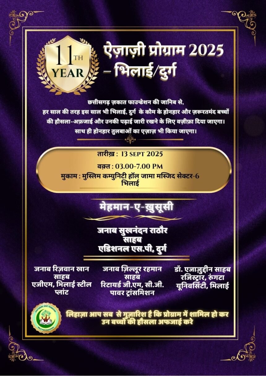 भिलाई। छत्तीसगढ़ ज़कात फाउन्डेशन की ओर से भिलाई-दुर्ग और राजनांदगांव के होनहार स्टूडेंट का सम्मान समारोह 13 सितंबर शनिवार को अपराह्न 3 बजे से जामा मस्जिद सेक्टर-6 के कम्युनिटी हॉल में रखा गया है। इस दौरान ज़रूरत मंद बच्चो की हौसला अफजाई व उनकी पढ़ाई जारी रखने के लिए वजीफा भी दिया जाएगा।
