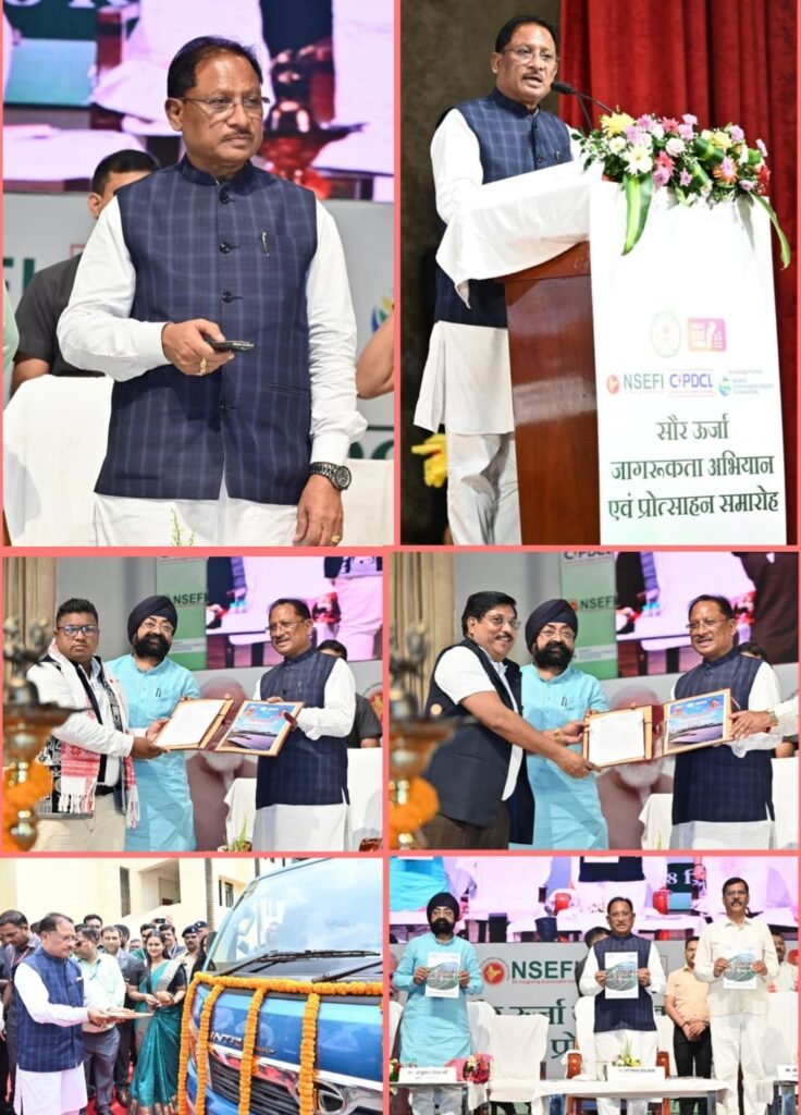 रायपुर। प्रदेश में सौर ऊर्जा के उपभोक्ता अब केवल ऊर्जा उत्पादक ही नहीं, बल्कि ऊर्जा दाता भी बन रहे हैं। पीएम सूर्यघर मुफ्त बिजली योजना जैसी महत्वाकांक्षी पहल के माध्यम से प्रदेश स्वच्छ ऊर्जा के लक्ष्य की प्राप्ति के संकल्प को तीव्र गति से पूर्ण करने की ओर अग्रसर है। मुख्यमंत्री विष्णु देव साय ने आज राजधानी रायपुर स्थित पंडित दीनदयाल उपाध्याय ऑडिटोरियम में आयोजित सौर ऊर्जा जागरूकता और प्रोत्साहन अभियान को संबोधित करते हुए यह बात कही।