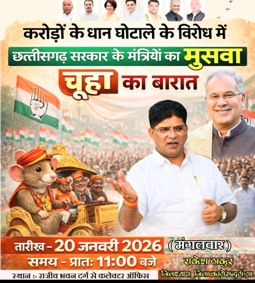 दुर्ग। छत्तीसगढ़ में सरकारी गोदामों में करोड़ों रुपये के धान को “मुसवा (चूहा)” द्वारा नष्ट किए जाने के मामले में भाजपा सरकार की जवाबदेही से बचने की कोशिश के विरोध में जिला कांग्रेस कमेटी, दुर्ग (ग्रामीण) द्वारा 20 जनवरी को राजीव भवन दुर्ग से कलेक्टर कार्यालय तक प्रतीकात्मक एवं शांतिपूर्ण मुसवा प्रदर्शन किया जाएगा।