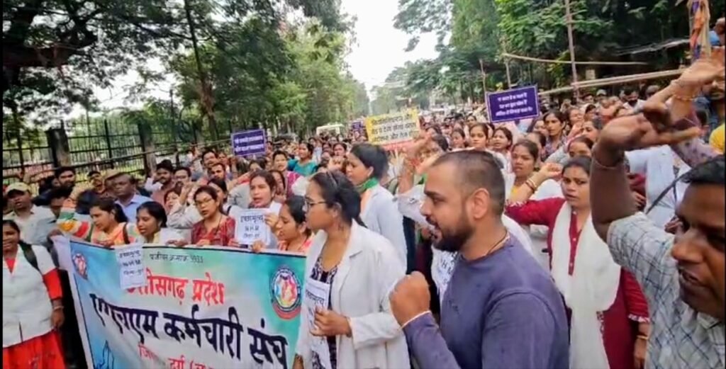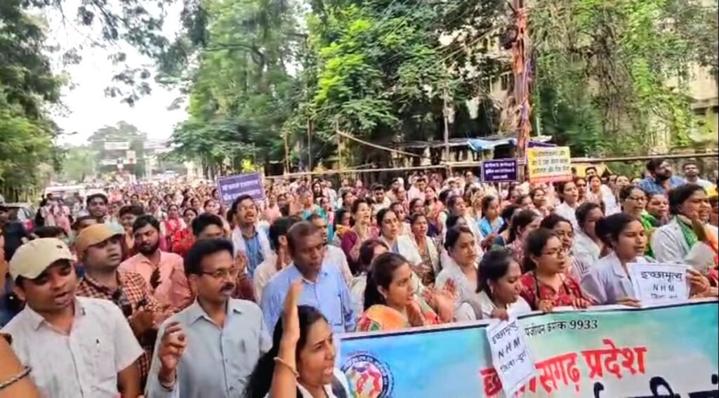 दुर्ग। राष्ट्रीय स्वास्थ्य मिशन (NHM) के अंतर्गत कार्यरत संविदा स्वास्थ्य कर्मियों की अनिश्चितकालीन हड़ताल को 30 दिन हो चुके हैं, लेकिन अब तक सरकार द्वारा कोई ठोस आदेश जारी नहीं किया गया है। कर्मचारियों के धैर्य का बांध अब टूटता नजर आ रहा है। सोमवार को दुर्ग जिले में गांधी चौक पर सैकड़ों कर्मियों ने शासन की दमनकारी नीतियों के विरोध में विशाल रैली निकाली और राज्यपाल के नाम इच्छा मृत्यु की मांग करते हुए ज्ञापन कलेक्टर को सौंपा।