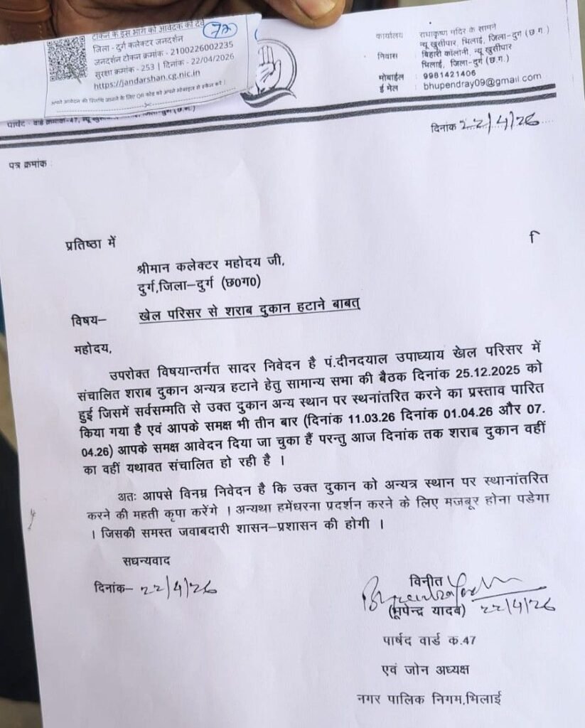 बताया गया कि खुर्सीपार खेल परिसर में शराब दुकान खुलने के बाद से स्थानीय नागरिकों, खिलाड़ियों और जनप्रतिनिधियों में नाराजगी बनी हुई है। इसे लेकर पूर्व में भी कई बार प्रशासन को अवगत कराया जा चुका है। नगर निगम की सामान्य सभा में 25 दिसंबर 2025 को सर्वसम्मति से प्रस्ताव पारित कर दुकान को अन्यत्र शिफ्ट करने की अनुशंसा की गई थी। इसके बावजूद अब तक कोई ठोस कार्रवाई नहीं हो सकी है।