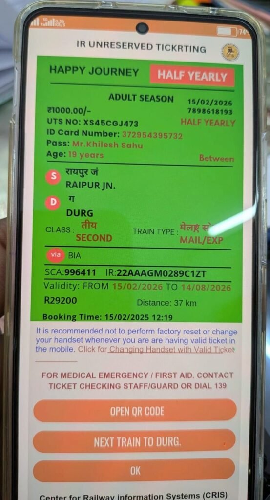 रायपुर, 28 अप्रैल, 2026, दक्षिण पूर्व मध्य रेलवे रायपुर रेल मंडल के वाणिज्य विभाग के अधिकारियों कर्मचारियों की सक्रियता से निर्देशानुसार ट्रेन संख्या 68705 (रायपुर–डोंगरगढ़ लोकल) में विशेष टिकट जांच अभियान चलाया गया। दुर्ग में आयोजित फोर्ट्रेस चेकिंग (किलाबंदी टिकट चेकिंग) के दौरान  प्रिया, वरिष्ठ टिकट एग्जामिनर, दुर्ग के द्वारा डुप्लीकेट एमएसटी (छ: माही) का मामला पकड़ा गया, जिसकी सूचना तत्पश्चात उच्च अधिकारियों को दी गई।