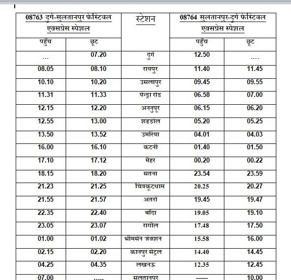 रायपुर। फेस्टिवल के अवसर पर दुर्ग एवं सुलतानपुर के मध्य रेल यात्रियो की सुविधा को ध्यान में रखते हुए रेलवे प्रशासन के द्वारा दो फेरे के लिए फेस्टिवल स्पेशल गाड़ी 08763/ 08764 दुर्ग-सुलतानपुर-दुर्ग के मध्य 12 फेरे के लिये चलाई जायेगी । यह गाड़ी दुर्ग से 08763 नंम्बर के साथ प्रत्येक शनिवार को दिनांक 13 सितम्बर से 29 नवम्बर, 2025 तक तथा सुलतानपुर से 08764 नम्बर के साथ प्रत्येक रविवार को दिनांक 14 सितम्बर से 30 नवम्बर, 2025 तक फेस्टिवल एक्सप्रेस स्पेशल चलेगी । इस स्पेशल ट्रेन में 3 एसएलआर, 04 स्लीपर, 08 एसी थ्री, 01 एसी टू, 02 एसी टू कम एसी थ्री, 02 पवाएरकार सहित कुल 20 कोच रहेगी । इस गाड़ी की विस्तृत समय-सारणी निम्नानुसार है -👇🏻