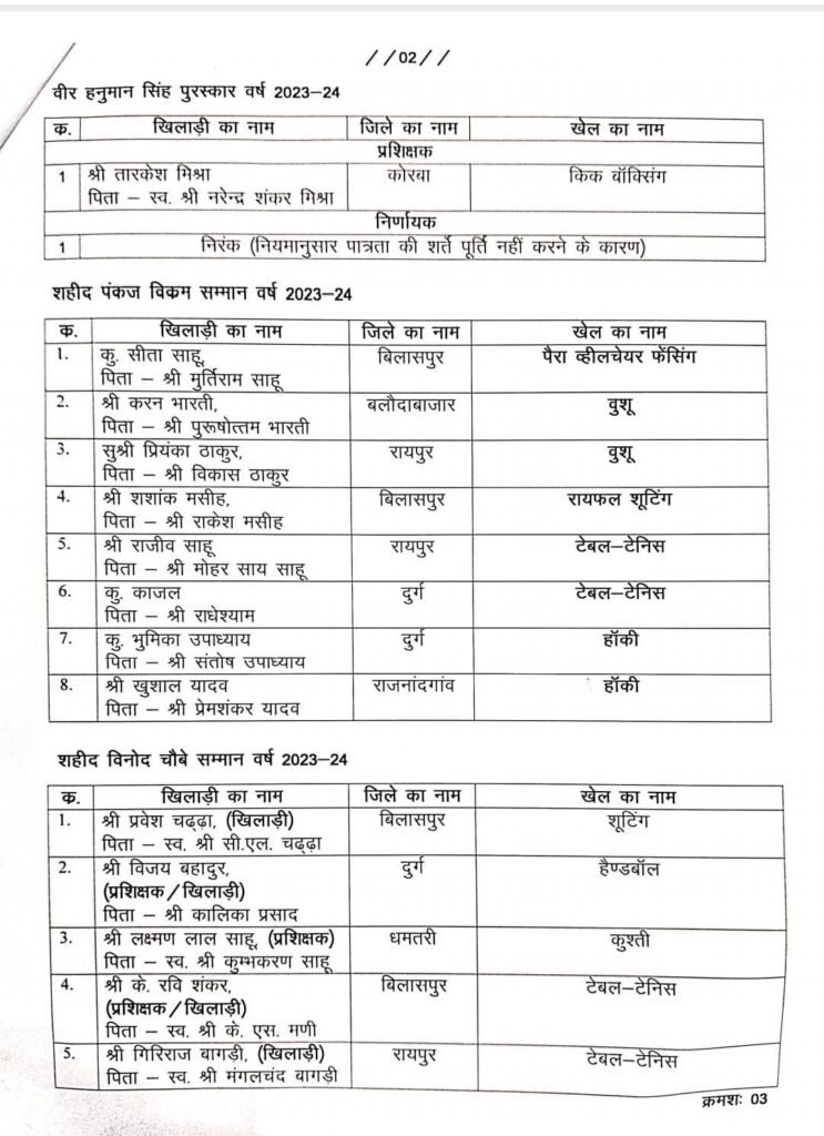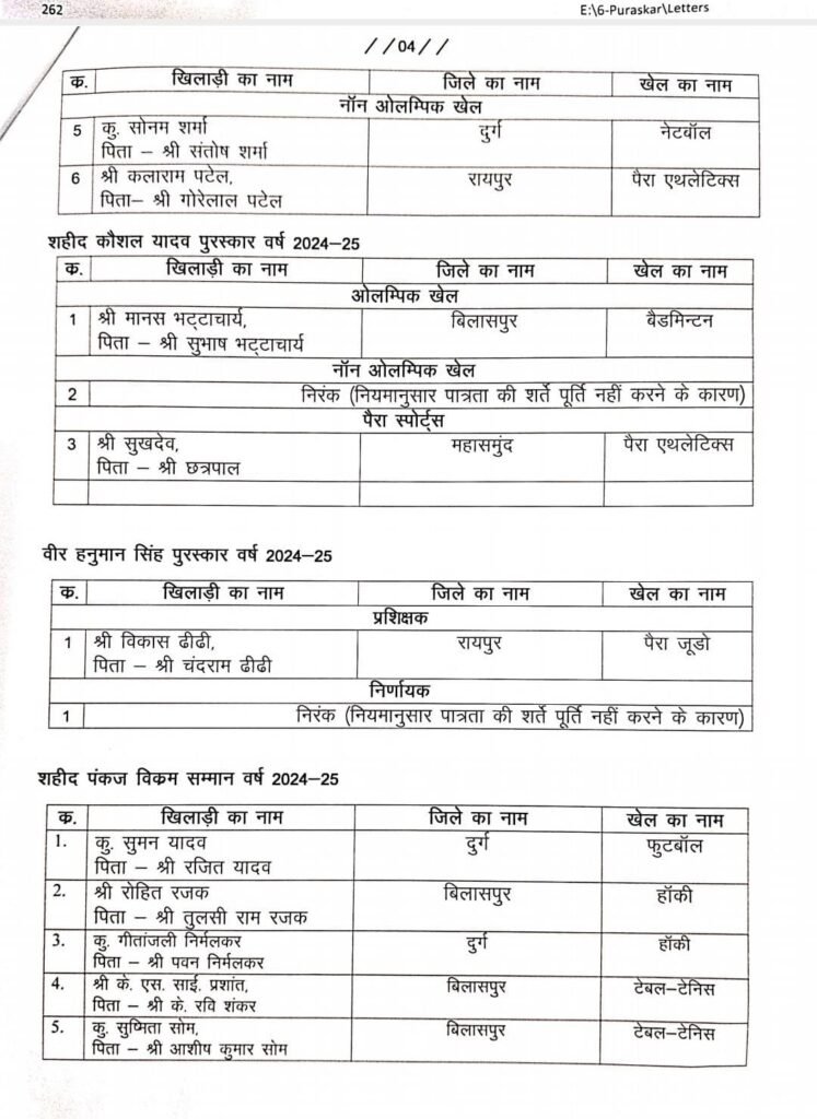 रायपुर। संचालनालय खेल एवं युवा कल्याण रायपुर द्वारा राज्य खेल अलंकरण समारोह -2025 (पुरस्कार वर्ष 2023-24 एवं 2024-25) हेतु पुरस्कार पाने वाले खिलाड़ियों, प्रशिक्षकों/निर्णायकों की अंतिम सूची जारी कर दी है। दिनांक 27.08.2025 तक दावा – आपत्ति आमंत्रित किए गए हैं।