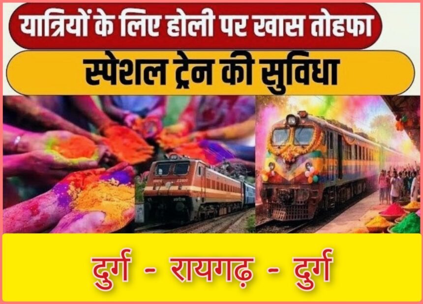 रायपुर, शुक्रवार, 27 फरवरी, दक्षिण पूर्व मध्य रेलवे रायपुर रेल मंडल में होली पर्व के अवसर पर यात्रियों की सुविधा के लिए दिनांक 02, 03, 05 एवं 06 फरवरी 2026 को गाड़ी संख्या 08834/08833 दुर्ग – रायगढ़ – दुर्ग के मध्य 04 फेरे के लिए होली मेमू पैसेंजर स्पेशल ट्रेन की सुविधा दी जा रही हैं ।