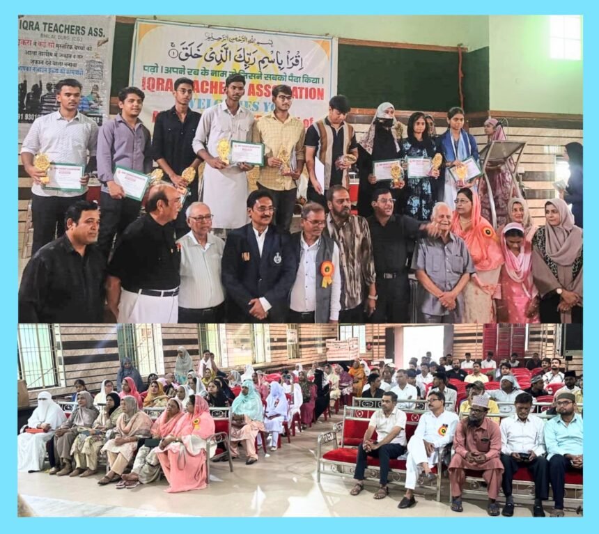 भिलाई। इस्पात नगरी की सेवाभावी संस्था इकरा टीचर्स एसोसिएशन की ओर से होनहार बच्चों का सम्मान समारोह जामा मस्जिद सेक्टर-6 के सामुदायिक भवन में रखा गया। इस दौरान मुख्य अतिथि 21 वीं बटालियन बालोद में डिप्टी कमांडेंट (अतिरिक्त पुलिस अधीक्षक) डॉ. इरफानुल रहीम खान व अन्य अतिथियों ने 10वीं और 12वीं में बेहतर अंक हासिल करने वाले बच्चों को सम्मानित किया। वहीं विभिन्न समाजसेवी संगठनों के कार्यों को भी सराहा गया। शुरुआत हाफिज मंजर आलम की कुरआन शरीफ की तिलावत से हुई।
