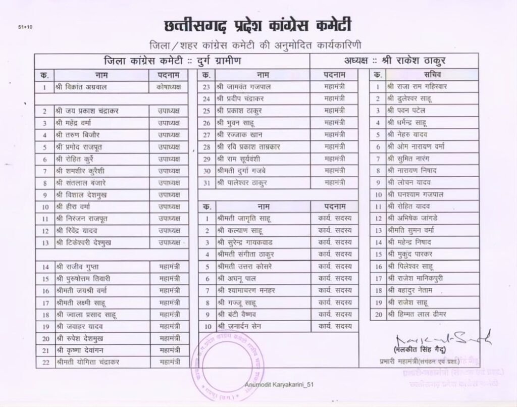 दुर्ग ग्रामीण में कांग्रेस की नई कार्यकारिणी घोषित