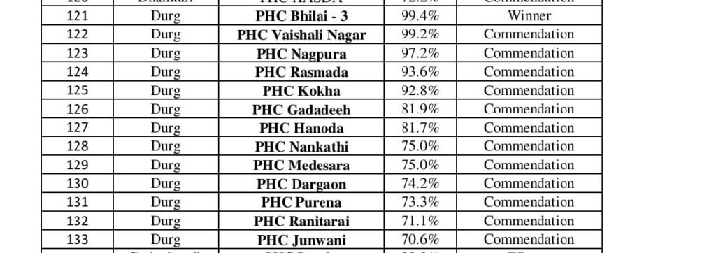 भिलाई। मिशन संचालक, स्वास्थ्य सेवाएं द्वारा राज्य की वर्ष 2024-25 की कायाकल्प योजना के अंतर्गत स्वच्छता, गुणवत्ता एवं स्वास्थ्य सेवाओं के मूल्यांकन सह अंकेक्षण की रिपोर्ट जारी कर दी गई है। इसमें दुर्ग जिले के 21 प्राथमिक स्वास्थ्य केंद्रों में से प्राथमिक स्वास्थ्य केंद्र भिलाई-3 ने 99.4 प्रतिशत अंक प्राप्त कर प्रथम स्थान हासिल किया है।