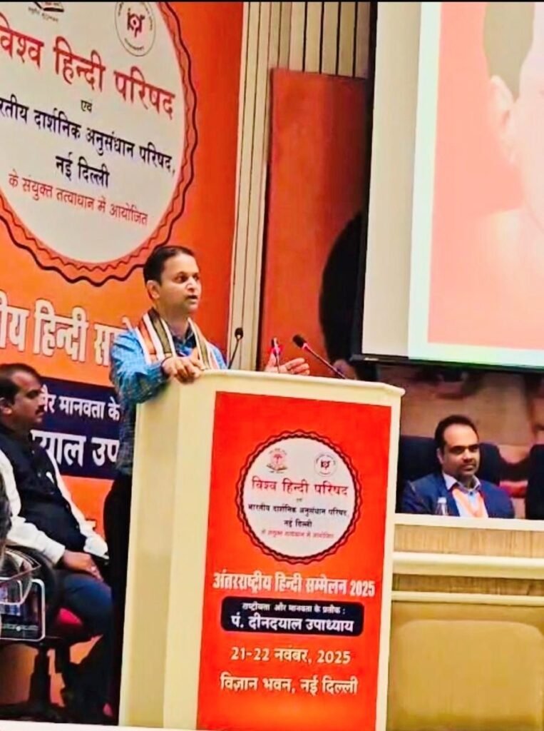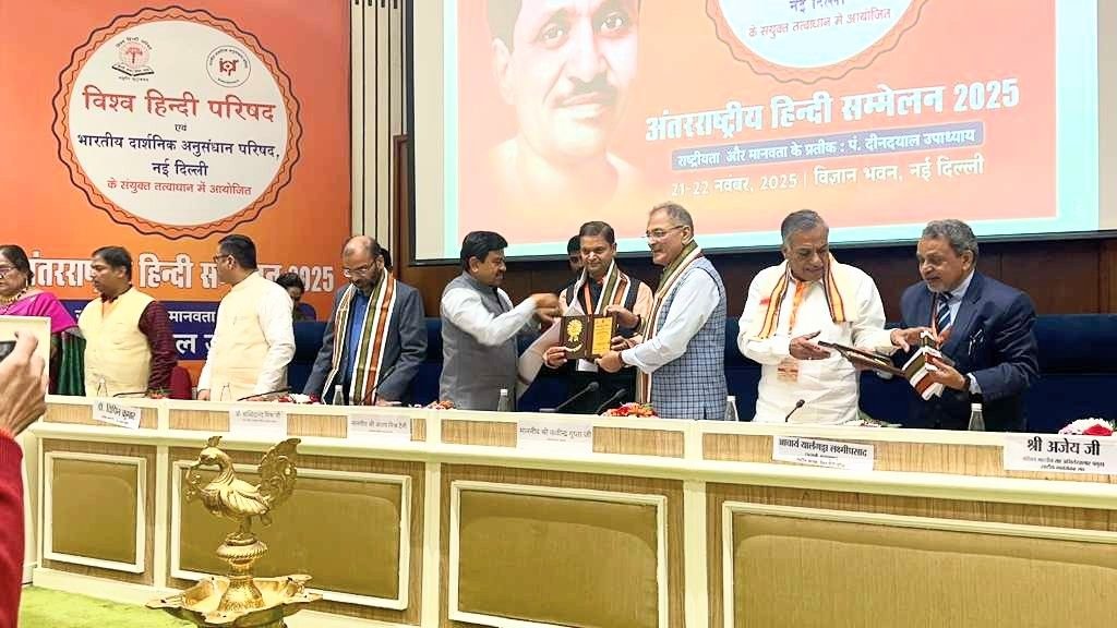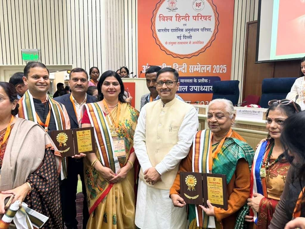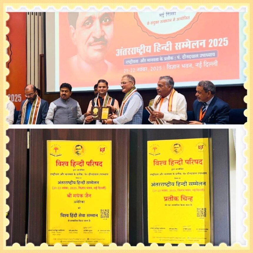विज्ञान भवन में 21–22 नवंबर को विश्व हिंदी परिषद और भारतीय दार्शनिक अनुसंधान परिषद के संयुक्त तत्वावधान में “राष्ट्रीयता और मानवता के प्रतीक : पंडित दीनदयाल उपाध्याय” विषय पर यह दो-दिवसीय अंतरराष्ट्रीय आयोजन हुआ। इस सम्मेलन में अमेरिका की संस्था हिंदी-यूएसए और उसके सेंट लुईस शाखा के समन्वयक मयंक जैन को हिंदी भाषा और भारतीय संस्कृति के वैश्विक विस्तार में असाधारण योगदान के लिए “हिंदी सेवा सम्मान” तथा “हिंदी प्रतीक चिह्न सम्मान” से विभूषित किया गया। यह सम्मान लद्दाख के उपराज्यपाल कवींद्र गुप्ता के करकमलों प्रदान किए गए।