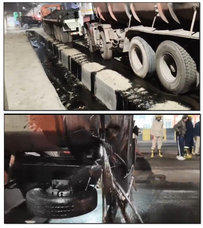 भिलाई। फोरलेन पर रायपुर–दुर्ग लेन में शिवाजी नगर जोन कार्यालय के पास मंगलवार को दो ट्रकों की टक्कर हो गई। दुर्घटना में एक ट्रक टैंकर था, जिसमें काला आयल भरा हुआ था। टक्कर के बाद टैंकर के पिछले हिस्से में क्षति होने से तेज धार में आयल सड़क पर फैलने लगा। जिससे मार्ग अत्यंत फिसलन भरा हो गया और वाहनों के अनियंत्रित होने की स्थिति बन गई।