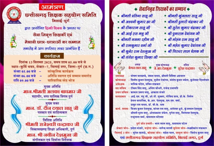 भिलाई : छत्तीसगढ़ शिक्षक सहयोग समिति भिलाई दुर्ग के तत्वावधान में प्रति वर्ष की भांति इस वर्ष भी हिन्दी दिवस की पूर्व संध्या पर शिक्षक सम्मान समारोह का आयोजन कुर्मी भवन सेक्टर सात भिलाई में संध्या 5 बजे 13 सितंबर दिन शनिवार को आयोजित की जाएगी।