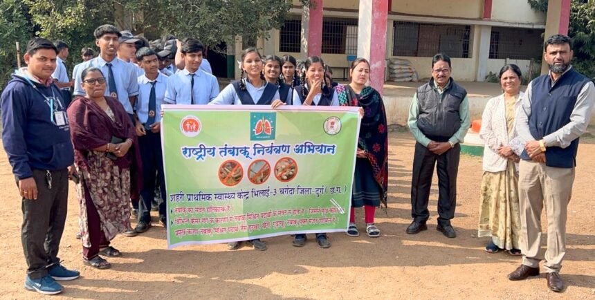 भिलाई। राष्ट्रीय तंबाकू नियंत्रण कार्यक्रम अंतर्गत स्वामी आत्मानंद हायर सेकेंडरी स्कूल चरोदा में जन जागरूकता अभियान चलाया गया। कलेक्टर अभिजीत सिंह, मुख्य चिकित्सा एवं स्वास्थ्य अधिकारी डॉ मनोज दानी, खंड चिकित्सा अधिकारी डॉ भुनेश्वर कठौतिया और मेडिकल ऑफिसर डॉ. कीर्ति तिर्की के संयुक्त मार्गदर्शन में यह आयोजन हुआ।