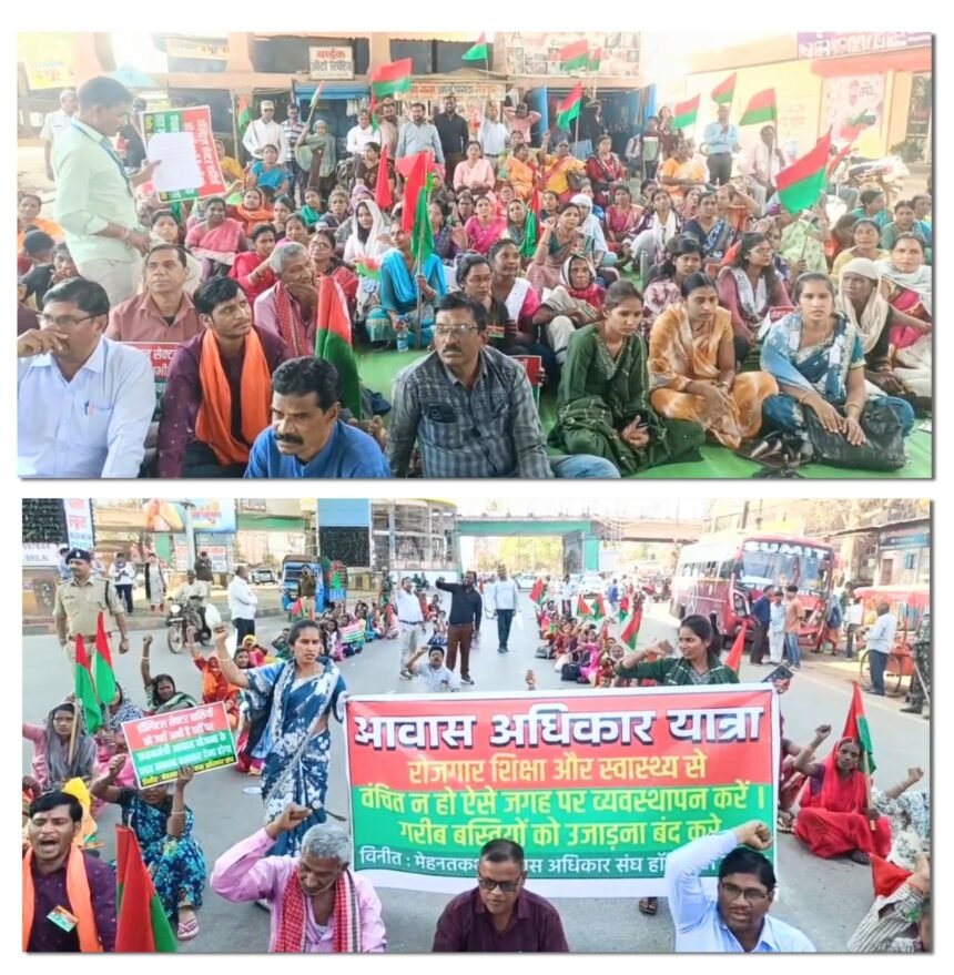 भिलाई, मंगलवार, भिलाई हॉस्पिटल सेक्टर में निवासरत सैकड़ों परिवारों को बेदखल किए जाने की कार्रवाई के विरोध में मंगलवार को मेहनतकश आवास अधिकार संघ के नेतृत्व में भिलाई पावर हाउस से विशाल रैली एवं आमसभा का आयोजन किया गया। रैली में हॉस्पिटल सेक्टर के निवासियों के साथ विभिन्न गरीब बस्तियों के मजदूरों और सामाजिक कार्यकर्ताओं ने बड़ी संख्या में भाग लेकर आवास अधिकार के समर्थन में आवाज बुलंद की।