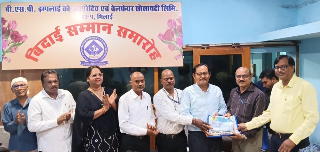 भिलाई। बीएसपी एम्पलाइज कोऑपरेटिव एंड वेलफेयर सोसाइटी लिमिटेड सेक्टर-4 ने समारोह का आयोजन कर माह अगस्त 2025 में भिलाई स्टील प्लांट की सेवा से निवृत्त हुए अपने सदस्य कर्मियों को ससम्मान विदाई दी। स्वागत उपरांत सोसाइटी के अध्यक्ष पूरनलाल देवांगन ने रिटायर कर्मियों को सम्मान पत्र, मिठाई, श्रीफल व अंतिम भुगतान का चेक प्रदान कर उन्हें भविष्य की शुभकामनाएं दी।