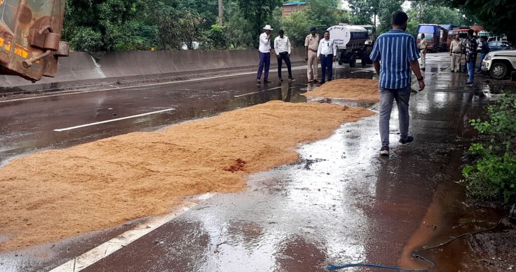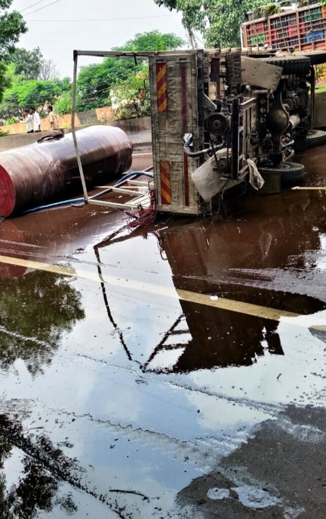 भिलाई : कुम्हारी के फोरलेन मार्ग पर सुबह करीब 11 बजे एक मिनी‑ट्रक के टायर फटने से बेलगाम हो गया और पलट गया, जिससे पीछे लगे टैंकर का केमिकल सड़क पर फैल गया; यह केमिकल तुरंत ही खारुन ग्रीन कॉलोनी के पास स्थित रहने वाले लोगों के पास तक पहुंच गया और लोगों में दहशत फैल गई।
