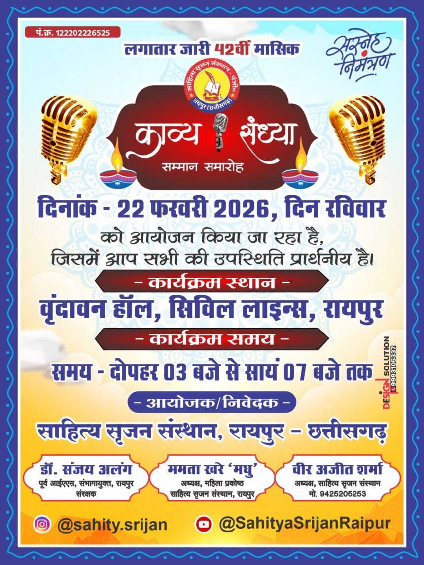 रायपुर, साहित्य सृजन संस्थान द्वारा लगातार आयोजित की जा रही 42वीं मासिक काव्य संध्या, सम्मान समारोह एवं स्वास्थ्य संबंधी जानकारी का कार्यक्रम 22 फरवरी को दोपहर 3 बजे से शाम 7 बजे तक सिविल लाइन्स स्थित वृंदावन हॉल में आयोजित किया जाएगा। कार्यक्रम में शहर एवं आसपास के जिलों के प्रतिष्ठित तथा युवा कवि-शायर अपनी रचनाओं का काव्य पाठ करेंगे।