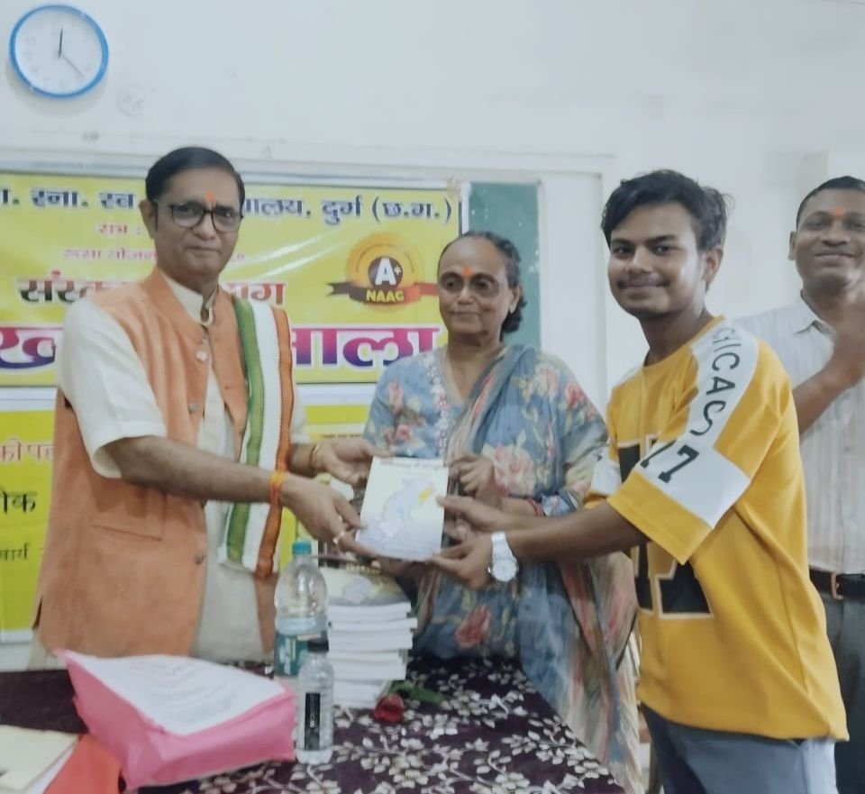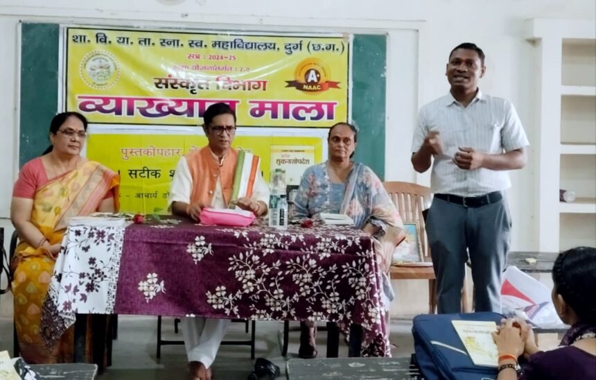 आचार्य डॉ.शर्मा साइंस कॉलेज दुर्ग में रूसा की विशेष व्याख्यानमाला में प्राध्यापकों एवं विद्यार्थियों को सम्बोधित कर रहे थे। अनेक पुस्तकों के लेखक और देश-विदेश के सफल भ्रमण कर चुके आचार्य डॉ. शर्मा ने शा.वि.या.ता.स्वशासी स्नातकोत्तर महाविद्यालय दुर्ग में अपनी दो पुस्तकें भी विद्यार्थियों और प्राध्यापकों को नि: शुल्क भेंट कीं। “शुकनासोपदेश”पाठ्य-पुस्तक है जबकि “छत्तीसगढ़ में संस्कृत” शोधपूर्ण सन्दर्भ ग्रन्थ है। युवा वर्ग के चरित्र निर्माण में और राज्य की स्थापना की रजत जयन्ती पर क्रमशः दौनों पुस्तकें महत्त्वपूर्ण हैं।