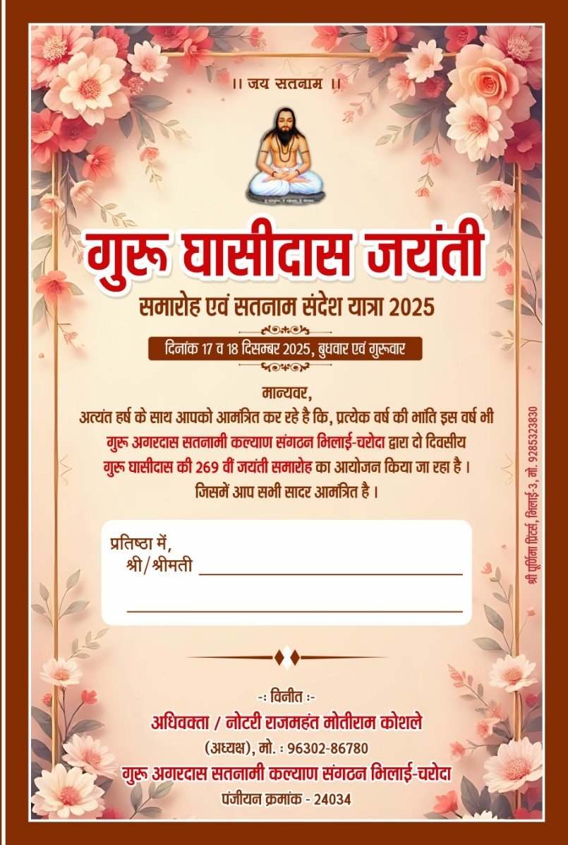 भिलाई-3। गुरु अगरदास सतनामी कल्याण संगठन भिलाई- चरोदा द्वारा इस वर्ष गुरु घासीदास जयंती को विशेष रूप से मनाया जाएगा। संगठन के अध्यक्ष एडवोकेट/नोटरी मोतीराम कोशले ने बताया कि दो दिवसीय कार्यक्रम सतनाम भवन, भिलाई-3 में हर्षोल्लास के साथ आयोजित किया जा रहा है।
