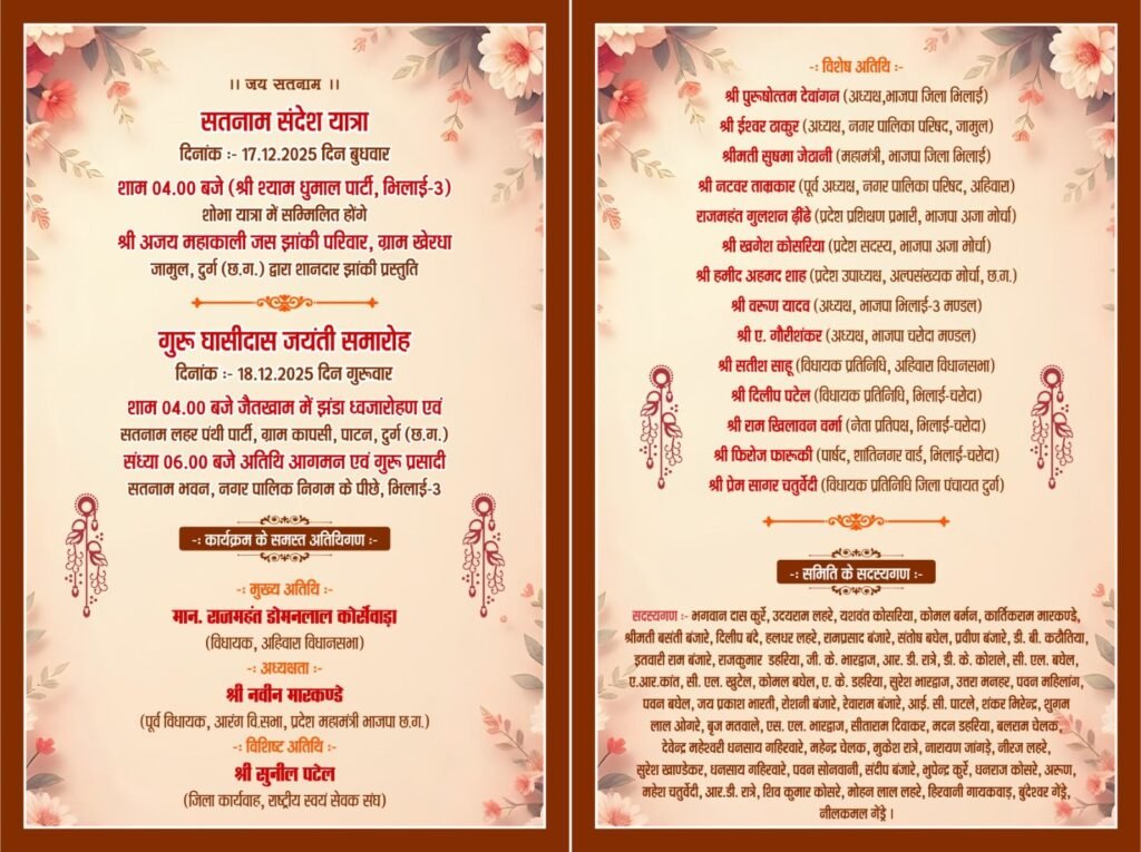 17 दिसंबर को दोपहर 3 बजे से सतनाम संदेश यात्रा निकाली जाएगी। यह यात्रा सतनाम समाज के मूल संदेशह्नसत्य, अहिंसा और समानताह्नको जन-जन तक पहुंचाने के उद्देश्य से रखी गई है। यात्रा का मुख्य आकर्षण होगा श्री श्याम धुमाल पार्टी, भिलाई-3 का सांस्कृतिक प्रदर्शन तथा अजय महाकाली जस झांकी परिवार, ग्राम खेरधा (अहिवारा) की भव्य झांकी प्रस्तुति, जो धार्मिक उत्साह और सांस्कृतिक विरासत दोनों का संगम प्रस्तुत करेगी। इसके अगले दिन, 18 दिसंबर को गुरु घासीदास जयंती के अवसर पर कार्यक्रम शाम 4 बजे से प्रारंभ होगा। सतनाम लहर पंथी पार्टी, कापसी पाटन द्वारा विशेष प्रस्तुति दी जाएगी, जिसके बाद जैतखाम परिसर में झंडाध्वजारोहण किया जाएगा। संध्या 6 बजे से मुख्य अतिथियों का आगमन होगा और 7 बजे से गुरु प्रसादी का वितरण प्रारंभ किया जाएगा, जिसमें बड़ी संख्या में श्रद्धालुओं के उपस्थित रहने की संभावना है।