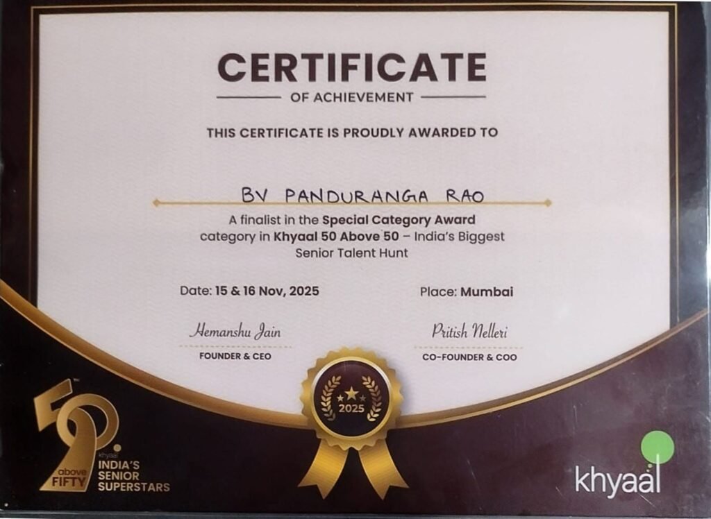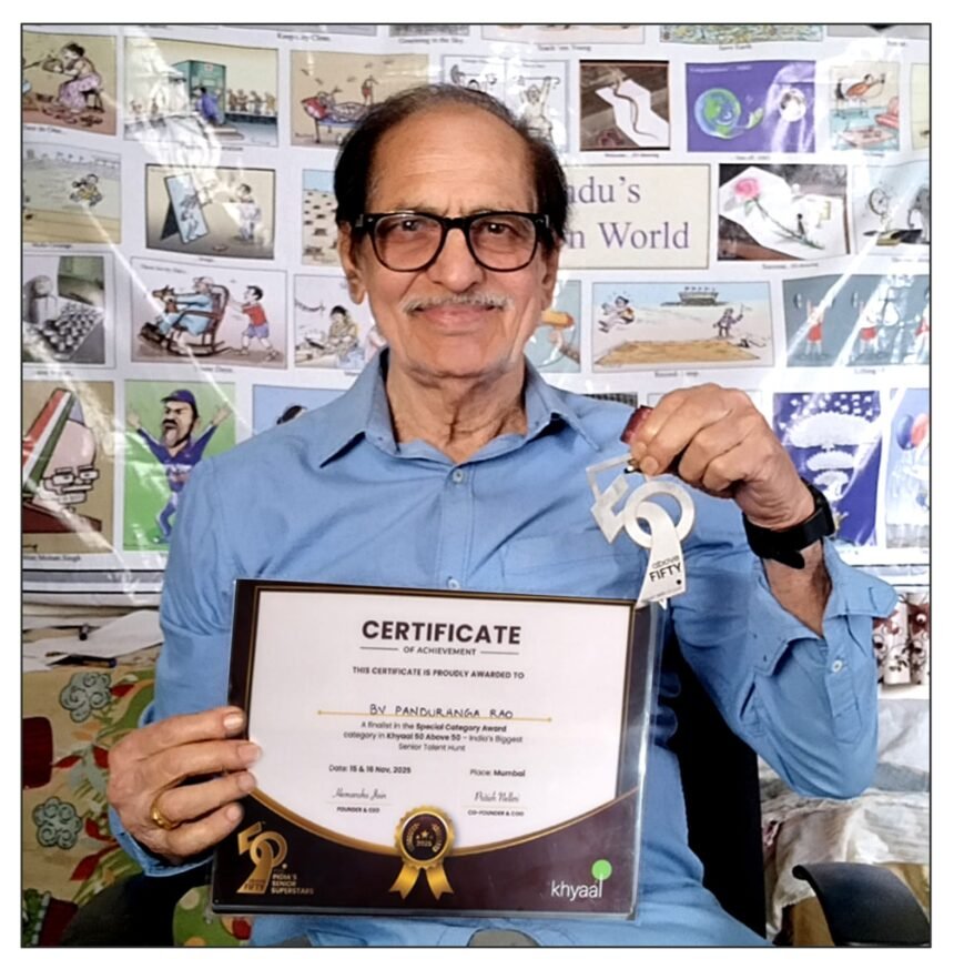 भिलाई। देश में वरिष्ठ नागरिकों के लिए आयोजित सीनियर टैलेंट हंट अवार्ड सीनियर सुपर स्टार ऑफ़ द ईयर ख्याल से वरिष्ठ कार्टूनिस्ट बीवी पांडुरंगा राव को सम्मानित किया गया। उन्हें साल 2025 के लिए विशेष श्रेणी में रनर अप घोषित किया गया है। भिलाई स्टील प्लांट के सेवानिवृत्त सीनियर मैनेजर पांडुरंगा राव को सर्टिफिकेट, एक मेडल और 10 हजार रुपये का नकद पुरस्कार दिया गया। इस प्रतियोगिता में देश भर से 50 साल से ज़्यादा उम्र के प्रतिभागियों ने हिस्सा लिया।