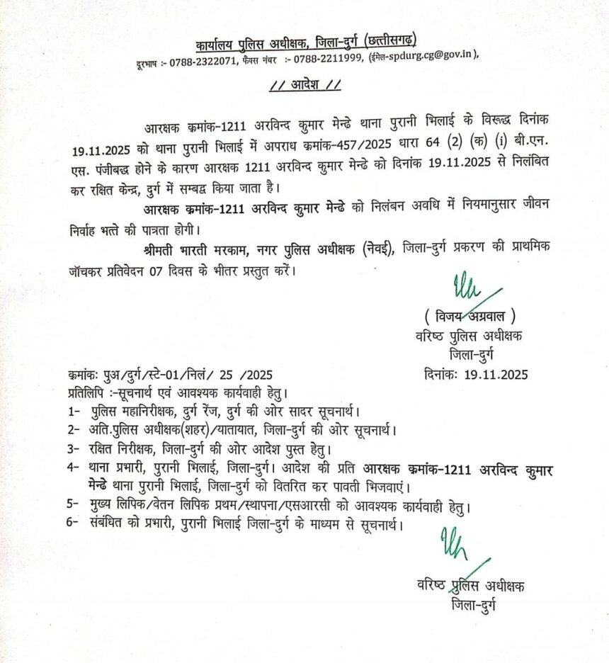 मामले की जानकारी मिलते ही एसएसपी विजय अग्रवाल ने तत्काल कार्रवाई करते हुए आरक्षक अरविंद कुमार मेन्ढे को बीएनएस की धारा 64(2)(क)(i) के तहत प्राथमिकी दर्ज होने पर निलंबित कर दिया। निलंबन अवधि में उसे रक्षित केंद्र, दुर्ग में सम्बद्ध किया गया है।