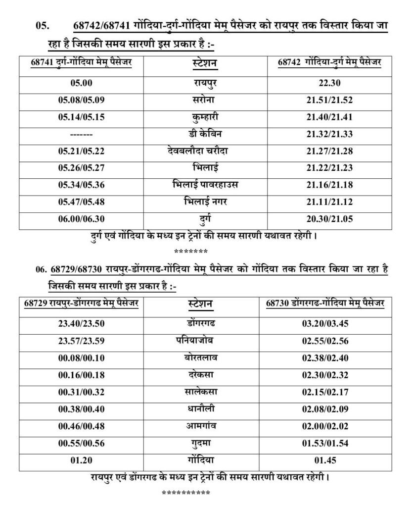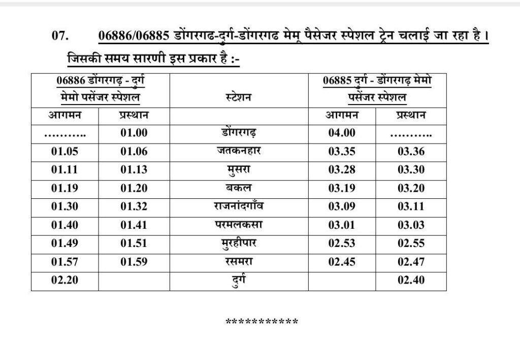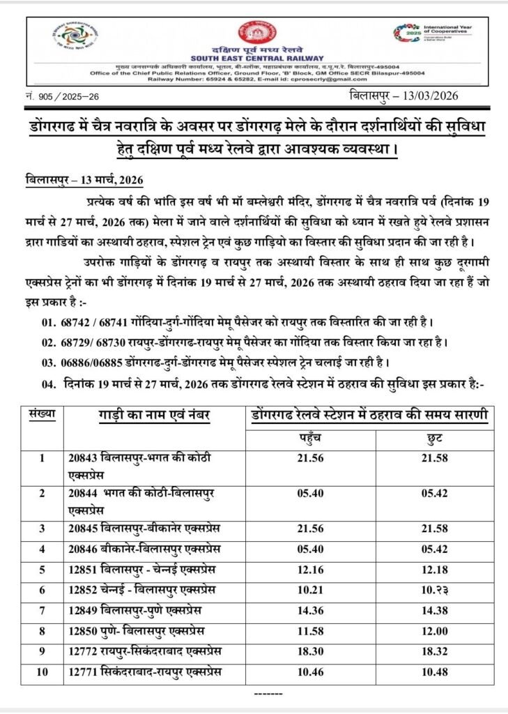 इस वर्ष चैत्र नवरात्रि मेला दिनांक 19 मार्च से 27 मार्च 2026 तक आयोजित किया जा रहा है। श्रद्धालुओं की सुविधा को ध्यान में रखते हुए दक्षिण पूर्व मध्य रेलवे द्वारा विशेष व्यवस्थाएँ की गई हैं। इसके अंतर्गत कुछ गाड़ियों का अस्थायी ठहराव, कुछ ट्रेनों का अस्थायी विस्तार तथा एक मेमू पैसेंजर स्पेशल ट्रेन चलाने का निर्णय लिया गया है, जिससे श्रद्धालुओं को यात्रा में अधिक सुविधा प्राप्त हो सके। विस्तृत जानकारी नीचे दिया गया है 👇