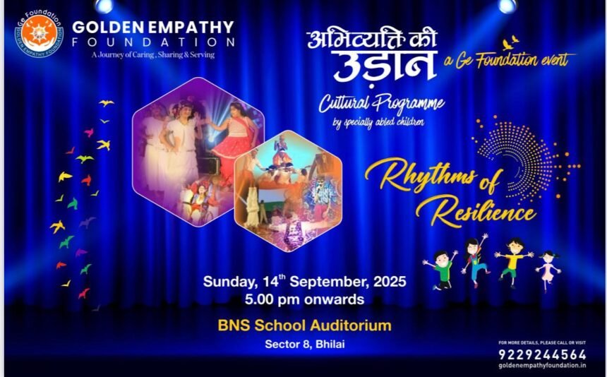 भिलाई। सामाजिक संस्था गोल्डन एम्पथी (जीई) फाउंडेशन की ओर से विशेष बच्चों की प्रतिभाओं को प्रोत्साहित करने हेतु एक भव्य सांस्कृतिक कार्यक्रम का आयोजन 14 सितम्बर रविवार को किया जा रहा है। यह कार्यक्रम शाम 5:30 बजे से रात्रि 8:30 बजे तक बी.एन.एस. ऑडिटोरियम, सेक्टर-8, भिलाई में संपन्न होगा। इस अवसर पर भिलाई सहित रायपुर, राजनांदगाँव और धमतरी के 15 विद्यालयों के विशेष बच्चे भाग लेने आ रहे हैं। वे अपनी कला, संगीत, नृत्य और अन्य सांस्कृतिक प्रस्तुतियों के माध्यम से अपनी अद्भुत प्रतिभा का प्रदर्शन करेंगे।