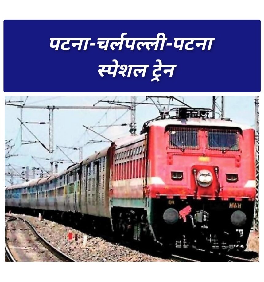 रायपुर, 07 अप्रैल ग्रीष्मकालीन के दौरान ट्रेनों में यात्रियों की होने वाली अतिरिक्त भीड़ को ध्यान में रखते हुये उन्हें कंफर्म बर्थ के साथ यात्रा सुविधा उपलब्ध कराने हेतु पटना-चर्लपल्ली-पटना के मध्य 15-15 फेरों के लिए स्पेशल ट्रेन का परिचालन किया जा रहा है । गाड़ी संख्या 03253 पटना-चर्लपल्ली स्पेशल ट्रेन, पटना से 08 अप्रैल 2026 से 27 मई 2026 तक (15 फेरा) प्रत्येक सोमवार एवं बुधवार को चलेगी | इसी प्रकार गाड़ी संख्या 03254 चर्लपल्ली-पटना स्पेशल ट्रेन, चर्लपल्ली से 15 अप्रैल 2026 से 27 मई 2026 तक (07 फेरा) प्रत्येक बुधवार को तथा गाड़ी संख्या 03255 चर्लपल्ली-पटना स्पेशल ट्रेन, चर्लपल्ली से 10 अप्रैल 2026 से 29 मई 2026 तक (08 फेरा) प्रत्येक शुक्रवार को चलेगी |