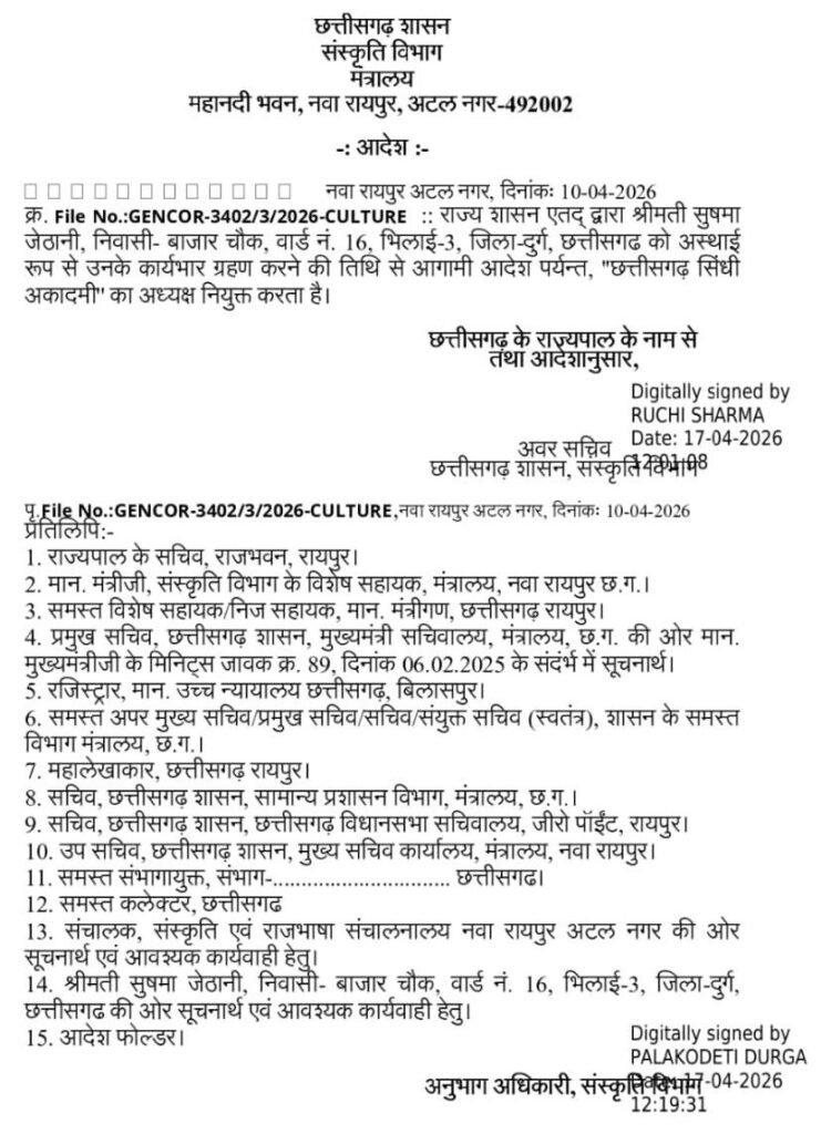 जारी आदेश के अनुसार यह नियुक्ति अस्थायी रूप से उनके कार्यभार ग्रहण करने की तिथि से आगामी आदेश तक प्रभावी रहेगी। यह आदेश छत्तीसगढ़ शासन की ओर से जारी किया गया है।