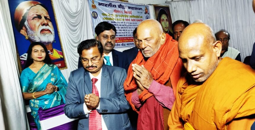 भिलाई। भारतीय बौद्ध महासभा संस्था (पंजीयन क्रमांक 1119) के नवनिर्वाचित पदाधिकारियों एवं कार्यकारिणी सदस्यों का भव्य शपथ ग्रहण समारोह सेक्टर–6 स्थित डॉ. अंबेडकर सांस्कृतिक भवन में आयोजित किया गया। सर्वप्रथम तथागत भगवान गौतम बुद्ध तथा भारत रत्न डॉक्टर बाबासाहेब अंबेडकर के छायाचित्र पर दीप प्रज्ज्वलन कर पुष्प अर्पित किए गए। कार्यक्रम में भिक्खु संघ की गरिमामय उपस्थित रही और त्रिशरण पंचशील की सामूहिक वंदना की गयी।