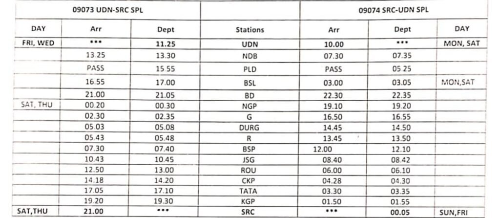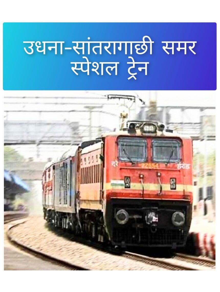 वापसी में गाड़ी संख्या 09074 सांतरागाछी-उधना समर स्पेशल 19, 24 और 26 अप्रैल 2026 को चलाई जाएगी। यह ट्रेन सांतरागाछी से रात 00:05 बजे रवाना होकर खड़गपुर, टाटानगर, चक्रधरपुर और राउरकेला होते हुए झारसुगुड़ा (08:40), बिलासपुर (12:00), रायपुर (13:45), दुर्ग (14:45), गोंदिया (16:50) और नागपुर (19:10) पहुंचेगी तथा अगले दिन सुबह 10:00 बजे उधना (सूरत) पहुंचेगी।