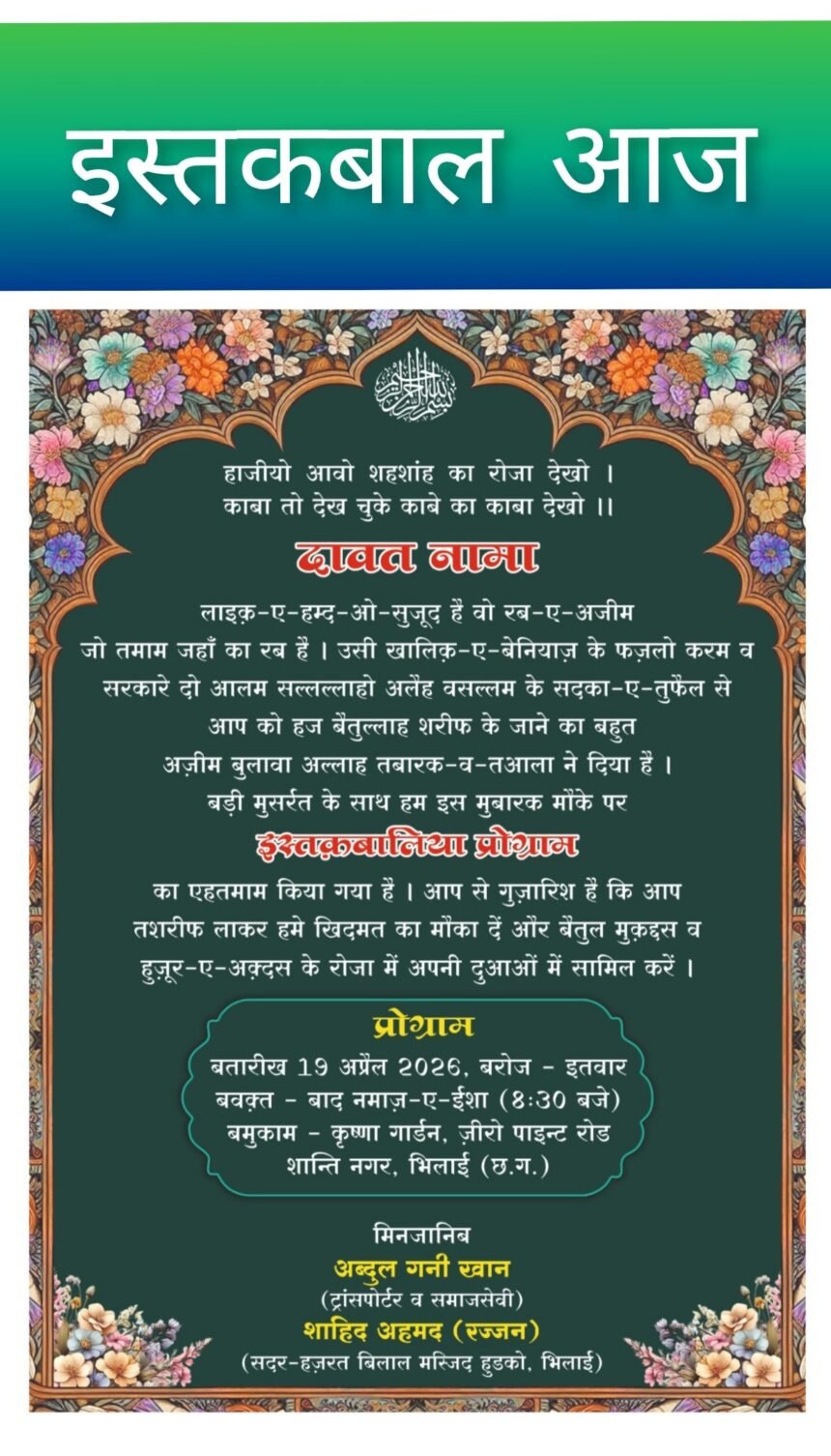 भिलाई, हज के मुबारक सफर पर जा रहे दुर्ग-भिलाई के खुशकिस्मतों का इस्तकबालिया प्रोग्राम 19 अप्रैल रविवार को कृष्णा गार्डन, ज़ीरो पाइन्ट रोड शान्ति नगर में रखा गया है। ट्रांसपोर्टर व समाजसेवी अब्दुल गनी खान और हज़रत बिलाल मस्जिद हुडको भिलाई के सदर शाहिद अहमद (रज्जन) ने बताया कि बाद नमाज़-ए-ईशा रात 8:30 बजे से यह प्रोग्राम होगा। उन्होंने सभी हुज्जाजे किराम से शिरकत और खिदमत का मौका देकर अपनी दुआओं में शामिल करने की अपील की है।
